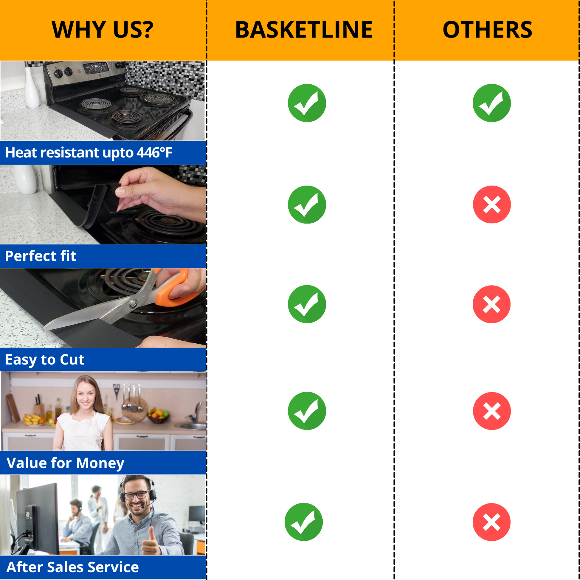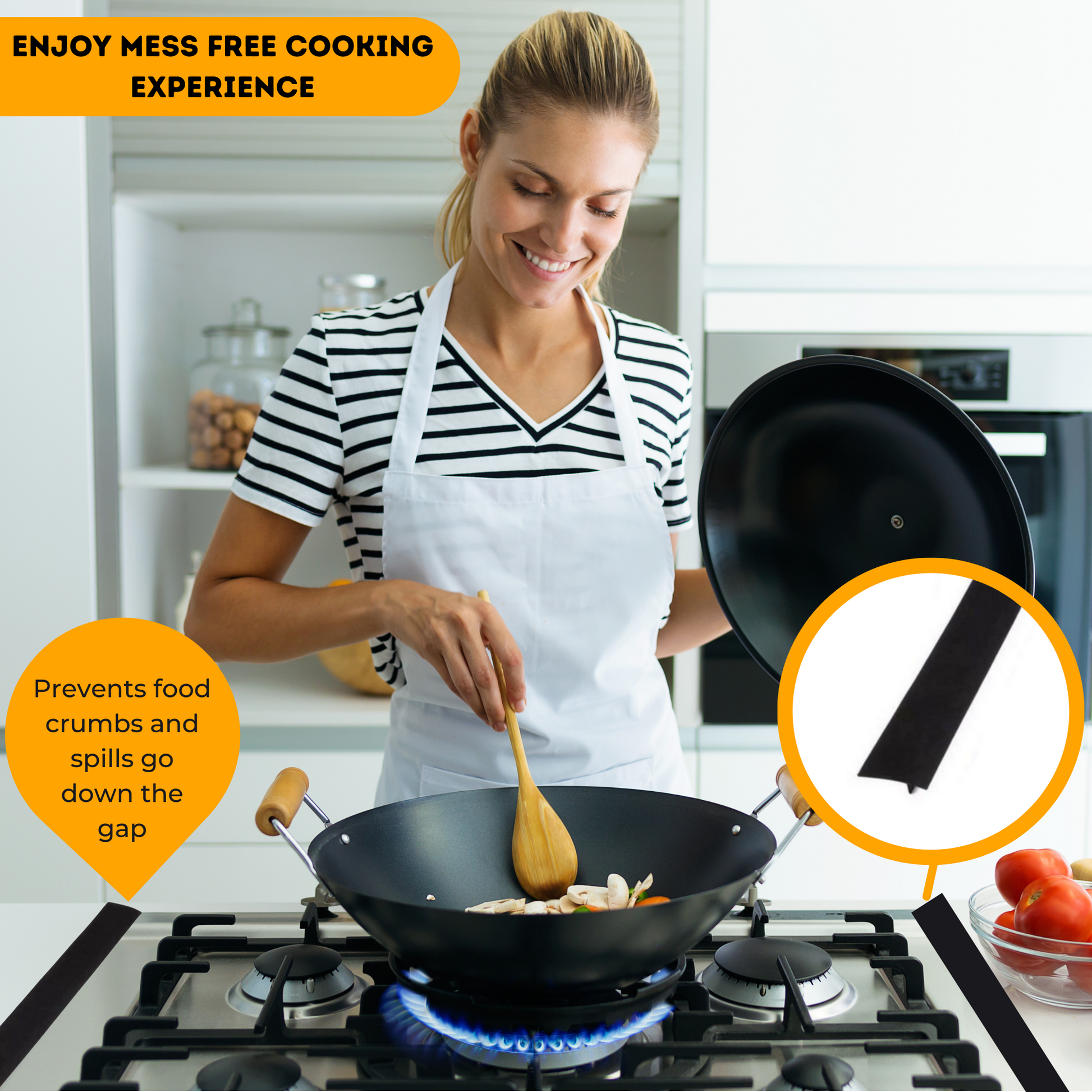 The Basketline stove gap cover is the ultimate solution for debris, grease, and food particles dropping between your countertop and stove. Dustproof, anti-slip, flexible, and heat-resistant, the 100% food-grade countertop cover features a shiny back surface and will stick very well on any surface.